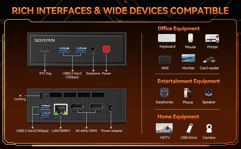 Multiple interfaces allow for easy device connections and function expansion.